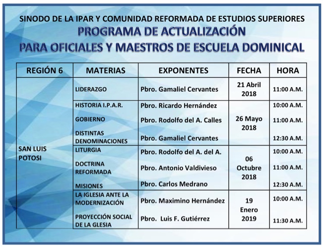 Proyecto 2018 del sínodo para actualizar los conocimientos de los ancianos, diaconos y maestros de la escuela dominical. Revisa las fechas y los lugares donde serán las capacitaciones... Y asiste a la que te queda más CERCA.
